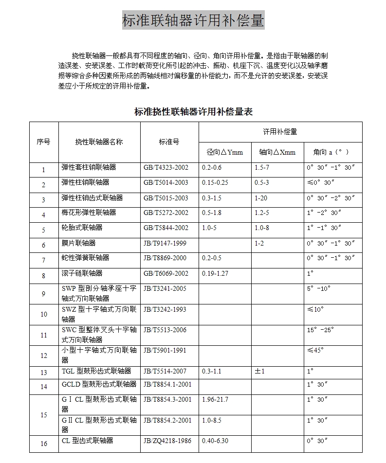 選用聯軸器時供參考的相關系數(根據GB/T7511-94)